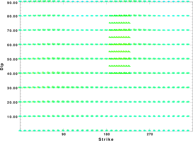 | Focal mechanism sensitivity at the preferred depth. The red color indicates a very good fit to the waveforms. Each solution is plotted as a vector at a given value of strike and dip with the angle of the vector representing the rake angle, measured, with respect to the upward vertical (N) in the figure. |