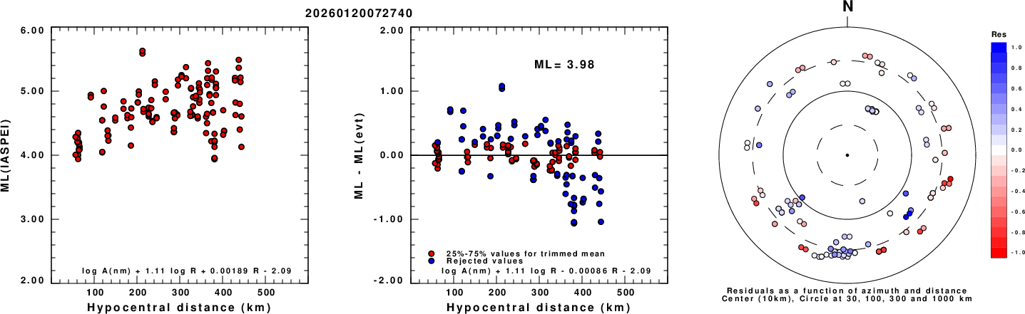 Left: ML computed using the IASPEI formula for Vertical components (research). Center: ML residuals computed using a modified IASPEI formula that accounts for path specific attenuation; the values used for the trimmed mean are indicated. The ML relation used for each figure is given at the bottom of each plot.