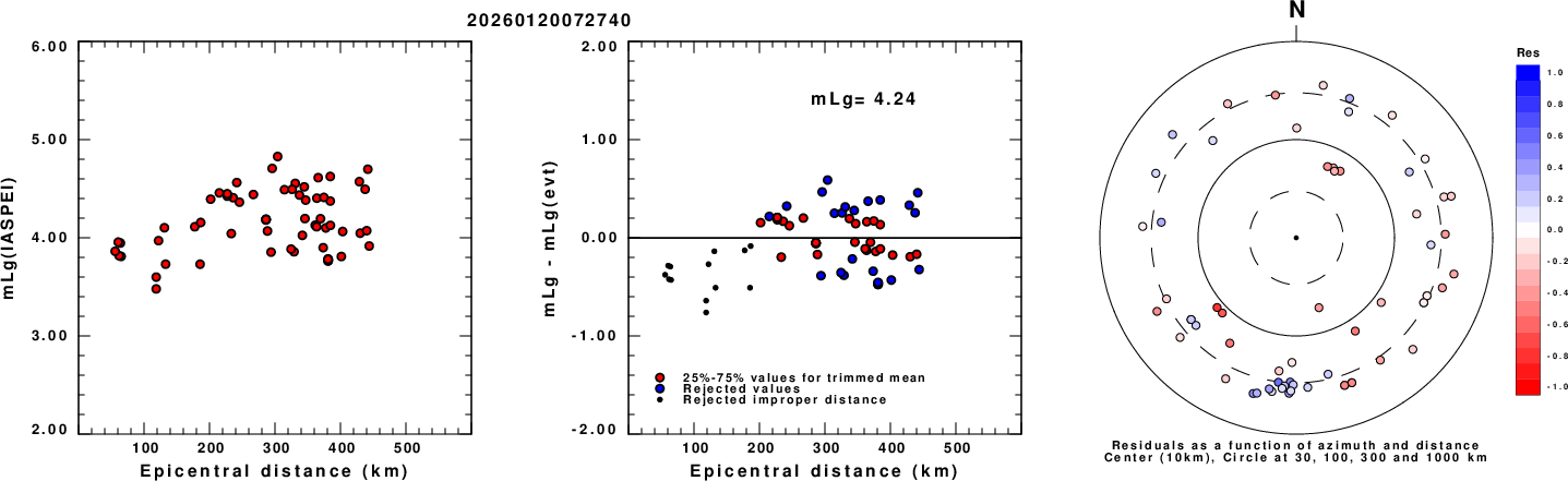 Left: mLg computed using the IASPEI formula. Center: mLg residuals versus epicentral distance ; the values used for the trimmed mean magnitude estimate are indicated.