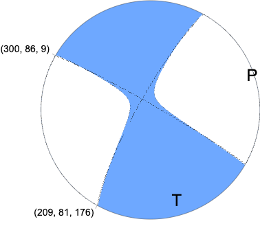 Regional Moment Tensor (Mwr) Moment 5.933e+14 N-m Magnitude 3.78 Mwr Depth 7.0 km Percent DC 94% Half Duration - Catalog US Data Source US Contributor US Nodal Planes Plane Strike Dip Rake NP1 300 86 9 NP2 209 81 176 Principal Axes Axis Value Plunge Azimuth T 5.843e+14 9 165 N 0.175e+14 80 322 P -6.018e+14 4 74 |