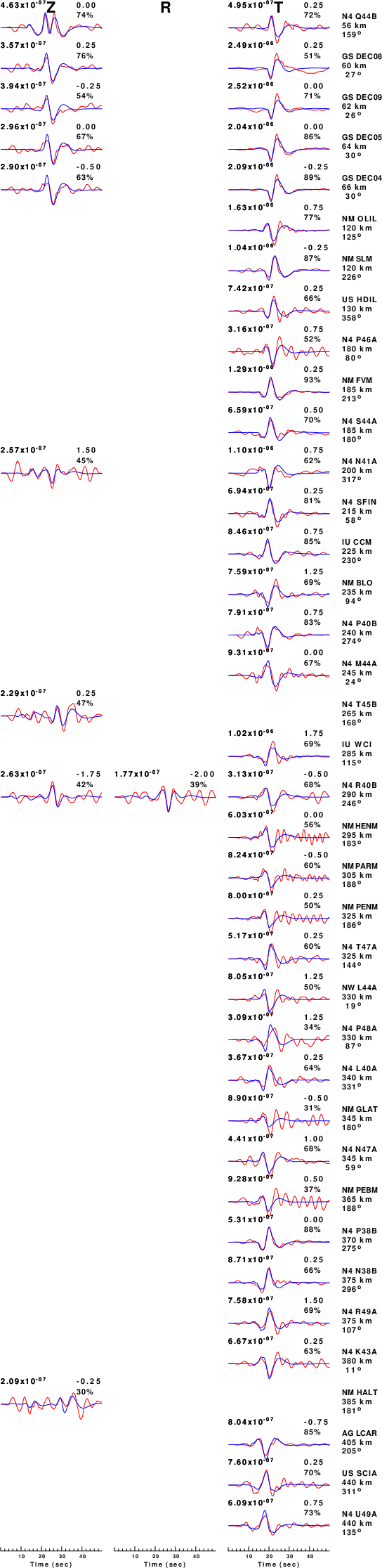 The comparison of the observed and predicted waveforms is given in the next figure. The red traces are the observed and the blue are the predicted. Each observed-predicted component is plotted to the same scale and peak amplitudes are indicated by the numbers to the left of each trace. A pair of numbers is given in black at the right of each predicted traces. The upper number it the time shift required for maximum correlation between the observed and predicted traces. This time shift is required because the synthetics are not computed at exactly the same distance as the observed, the velocity model used in the predictions may not be perfect and the epicentral parameters may be be off. A positive time shift indicates that the prediction is too fast and should be delayed to match the observed trace (shift to the right in this figure). A negative value indicates that the prediction is too slow. The lower number gives the percentage of variance reduction to characterize the individual goodness of fit (100% indicates a perfect fit).
