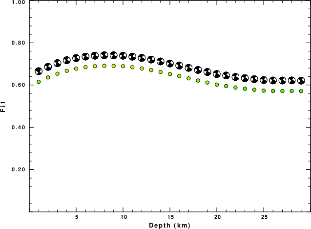 The program wvfgrd96 was used with good traces observed at short distance to determine the focal mechanism, depth and seismic moment. This technique requires a high quality signal and well determined velocity model for the Green's functions. To the extent that these are the quality data, this type of mechanism should be preferred over the radiation pattern technique which requires the separate step of defining the pressure and tension quadrants and the correct strike.