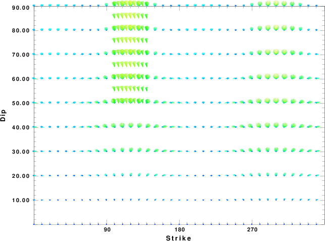 | Focal mechanism sensitivity at the preferred depth. The red color indicates a very good fit to the waveforms. Each solution is plotted as a vector at a given value of strike and dip with the angle of the vector representing the rake angle, measured, with respect to the upward vertical (N) in the figure. |