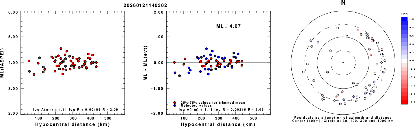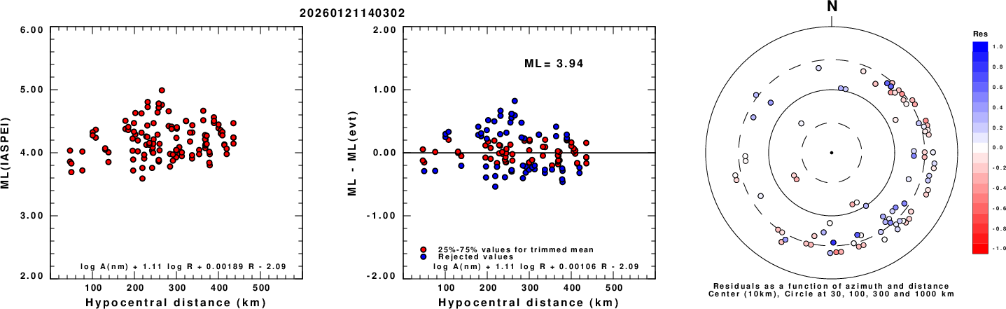 Left: ML computed using the IASPEI formula for Vertical components (research). Center: ML residuals computed using a modified IASPEI formula that accounts for path specific attenuation; the values used for the trimmed mean are indicated. The ML relation used for each figure is given at the bottom of each plot.