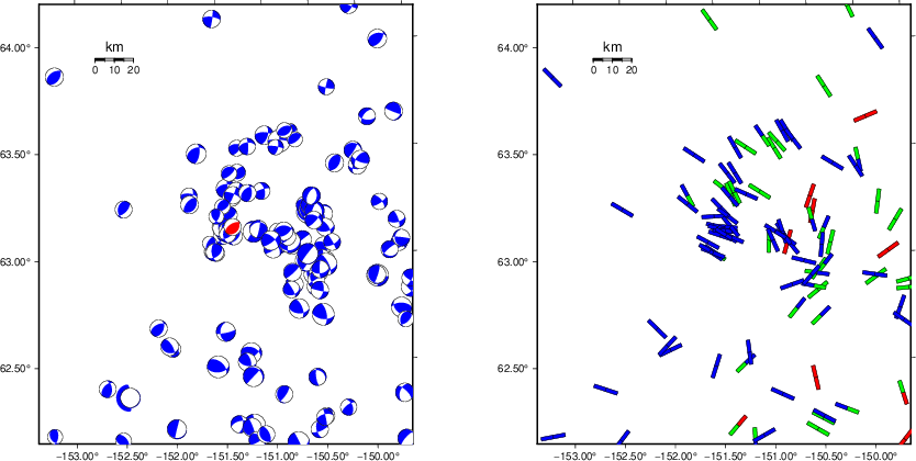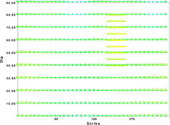 | Focal mechanism sensitivity at the preferred depth. The red color indicates a very good fit to the waveforms. Each solution is plotted as a vector at a given value of strike and dip with the angle of the vector representing the rake angle, measured, with respect to the upward vertical (N) in the figure. |