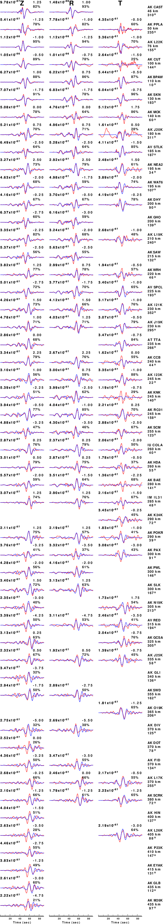 The comparison of the observed and predicted waveforms is given in the next figure. The red traces are the observed and the blue are the predicted. Each observed-predicted component is plotted to the same scale and peak amplitudes are indicated by the numbers to the left of each trace. A pair of numbers is given in black at the right of each predicted traces. The upper number it the time shift required for maximum correlation between the observed and predicted traces. This time shift is required because the synthetics are not computed at exactly the same distance as the observed, the velocity model used in the predictions may not be perfect and the epicentral parameters may be be off. A positive time shift indicates that the prediction is too fast and should be delayed to match the observed trace (shift to the right in this figure). A negative value indicates that the prediction is too slow. The lower number gives the percentage of variance reduction to characterize the individual goodness of fit (100% indicates a perfect fit).