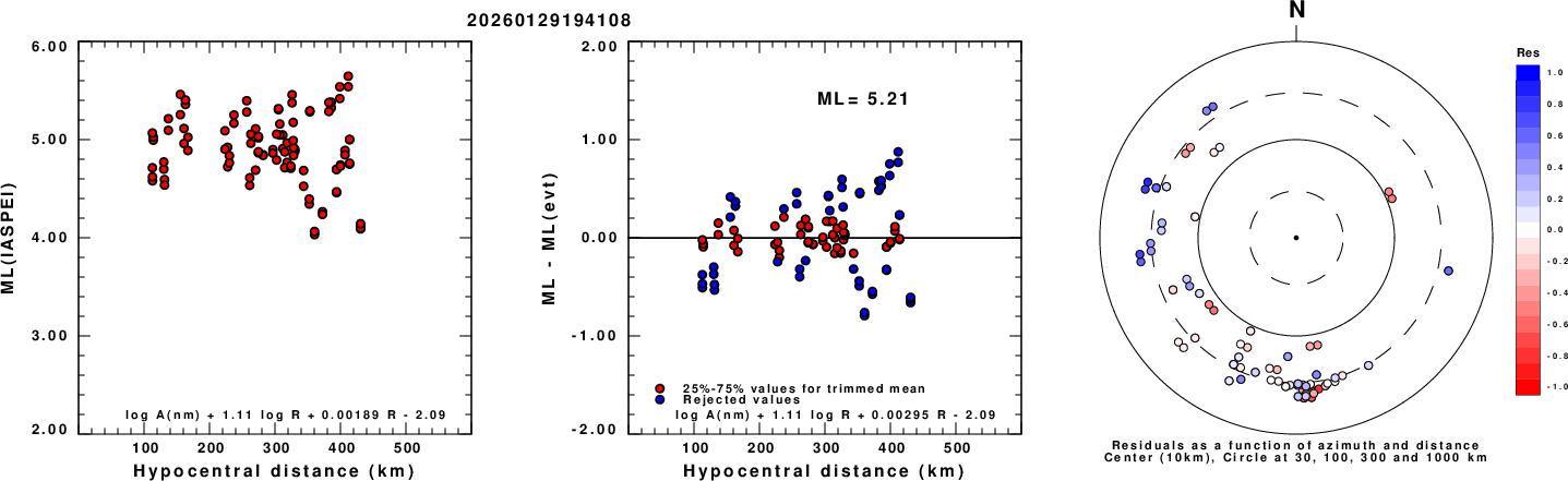 Given the availability of digital waveforms for determination of the moment tensor, this section documents the added processing leading to mLg, if appropriate to the region, and ML by application of the respective IASPEI formulae. As a research study, the linear distance term of the IASPEI formula for ML is adjusted to remove a linear distance trend in residuals to give a regionally defined ML. The defined ML uses horizontal component recordings, but the same procedure is applied to the vertical components since there may be some interest in vertical component ground motions. Residual plots versus distance may indicate interesting features of ground motion scaling in some distance ranges. A residual plot of the regionalized magnitude is given as a function of distance and azimuth, since data sets may transcend different wave propagation provinces.