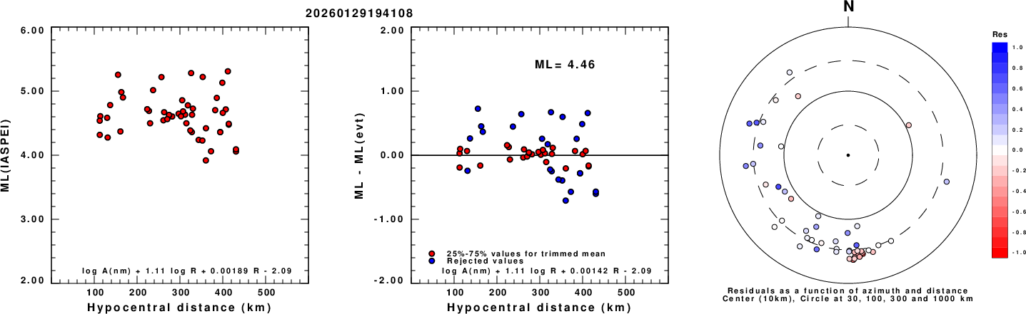 Left: ML computed using the IASPEI formula for Vertical components (research). Center: ML residuals computed using a modified IASPEI formula that accounts for path specific attenuation; the values used for the trimmed mean are indicated. The ML relation used for each figure is given at the bottom of each plot.
