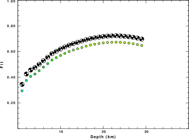 The program wvfgrd96 was used with good traces observed at short distance to determine the focal mechanism, depth and seismic moment. This technique requires a high quality signal and well determined velocity model for the Green's functions. To the extent that these are the quality data, this type of mechanism should be preferred over the radiation pattern technique which requires the separate step of defining the pressure and tension quadrants and the correct strike.