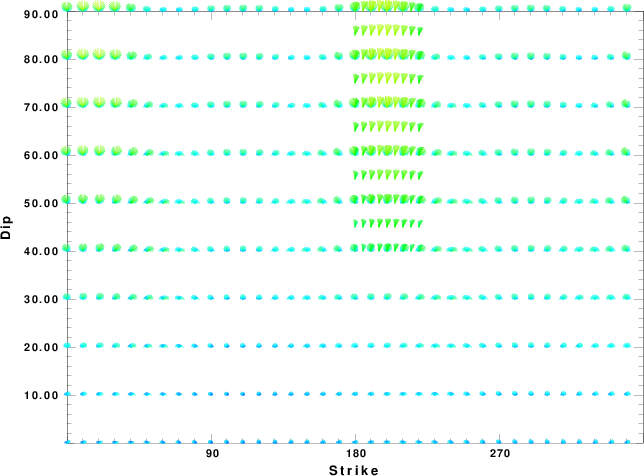 | Focal mechanism sensitivity at the preferred depth. The red color indicates a very good fit to the waveforms. Each solution is plotted as a vector at a given value of strike and dip with the angle of the vector representing the rake angle, measured, with respect to the upward vertical (N) in the figure. |