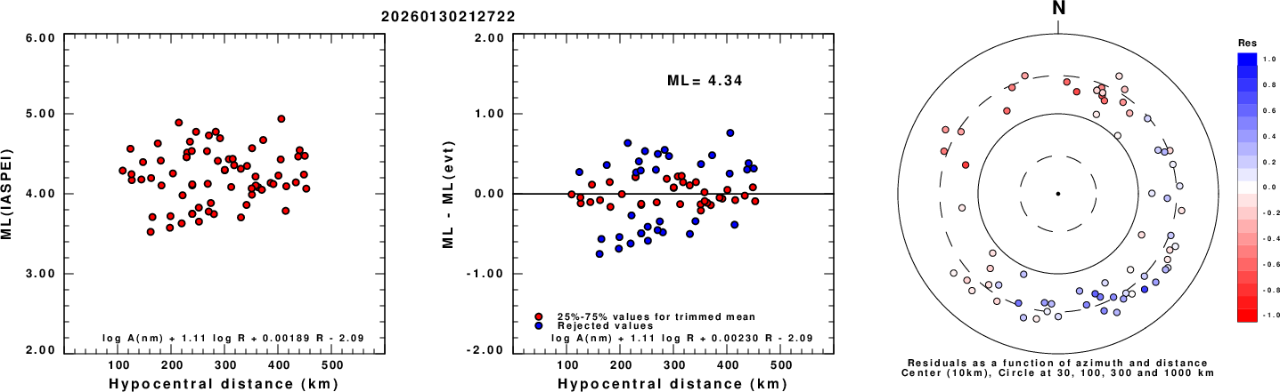 Left: ML computed using the IASPEI formula for Horizontal components. Center: ML residuals computed using a modified IASPEI formula that accounts for path specific attenuation; the values used for the trimmed mean are indicated. The ML relation used for each figure is given at the bottom of each plot.