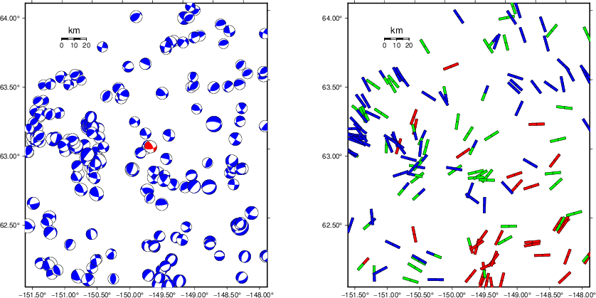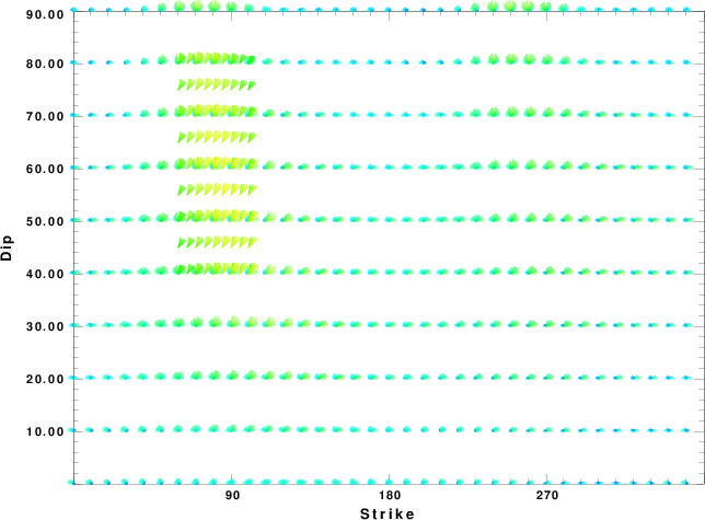| Focal mechanism sensitivity at the preferred depth. The red color indicates a very good fit to the waveforms. Each solution is plotted as a vector at a given value of strike and dip with the angle of the vector representing the rake angle, measured, with respect to the upward vertical (N) in the figure. |