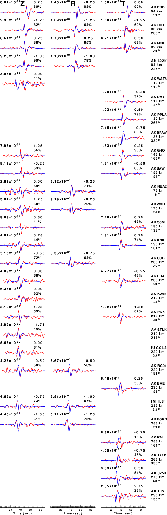 The comparison of the observed and predicted waveforms is given in the next figure. The red traces are the observed and the blue are the predicted. Each observed-predicted component is plotted to the same scale and peak amplitudes are indicated by the numbers to the left of each trace. A pair of numbers is given in black at the right of each predicted traces. The upper number it the time shift required for maximum correlation between the observed and predicted traces. This time shift is required because the synthetics are not computed at exactly the same distance as the observed, the velocity model used in the predictions may not be perfect and the epicentral parameters may be be off. A positive time shift indicates that the prediction is too fast and should be delayed to match the observed trace (shift to the right in this figure). A negative value indicates that the prediction is too slow. The lower number gives the percentage of variance reduction to characterize the individual goodness of fit (100% indicates a perfect fit).
