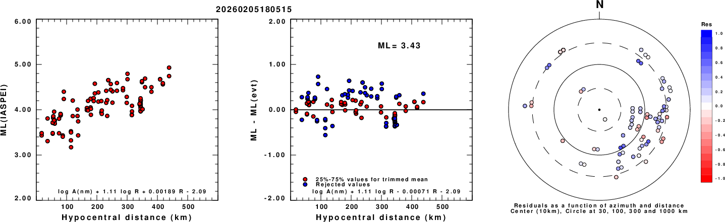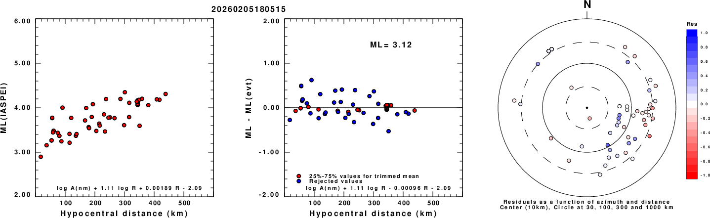 Left: ML computed using the IASPEI formula for Vertical components (research). Center: ML residuals computed using a modified IASPEI formula that accounts for path specific attenuation; the values used for the trimmed mean are indicated. The ML relation used for each figure is given at the bottom of each plot.