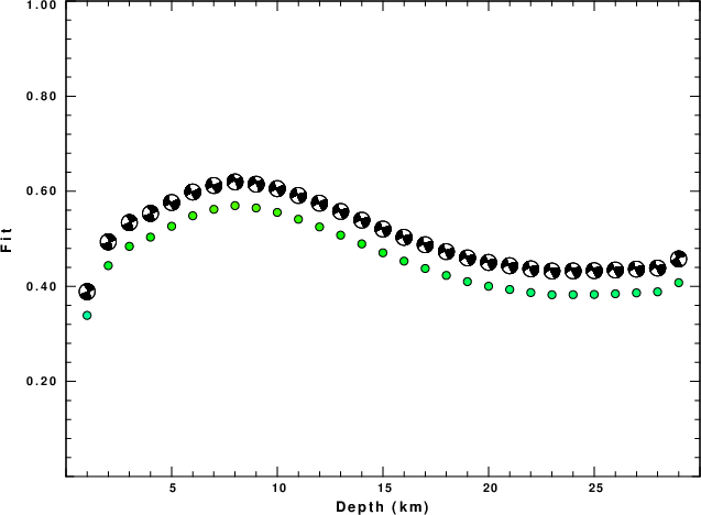 The program wvfgrd96 was used with good traces observed at short distance to determine the focal mechanism, depth and seismic moment. This technique requires a high quality signal and well determined velocity model for the Green's functions. To the extent that these are the quality data, this type of mechanism should be preferred over the radiation pattern technique which requires the separate step of defining the pressure and tension quadrants and the correct strike.