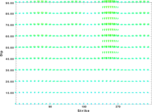 | Focal mechanism sensitivity at the preferred depth. The red color indicates a very good fit to the waveforms. Each solution is plotted as a vector at a given value of strike and dip with the angle of the vector representing the rake angle, measured, with respect to the upward vertical (N) in the figure. |
