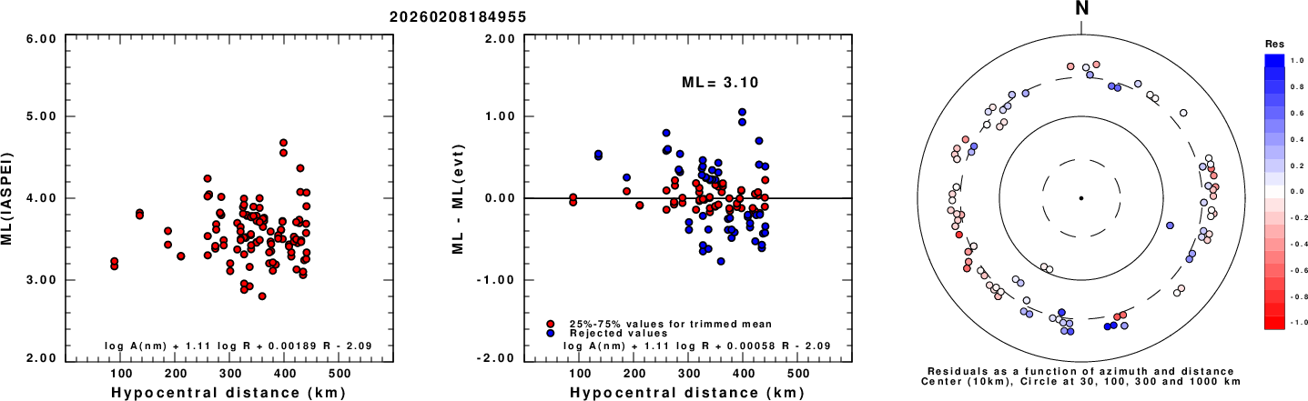 Left: ML computed using the IASPEI formula for Vertical components (research). Center: ML residuals computed using a modified IASPEI formula that accounts for path specific attenuation; the values used for the trimmed mean are indicated. The ML relation used for each figure is given at the bottom of each plot.