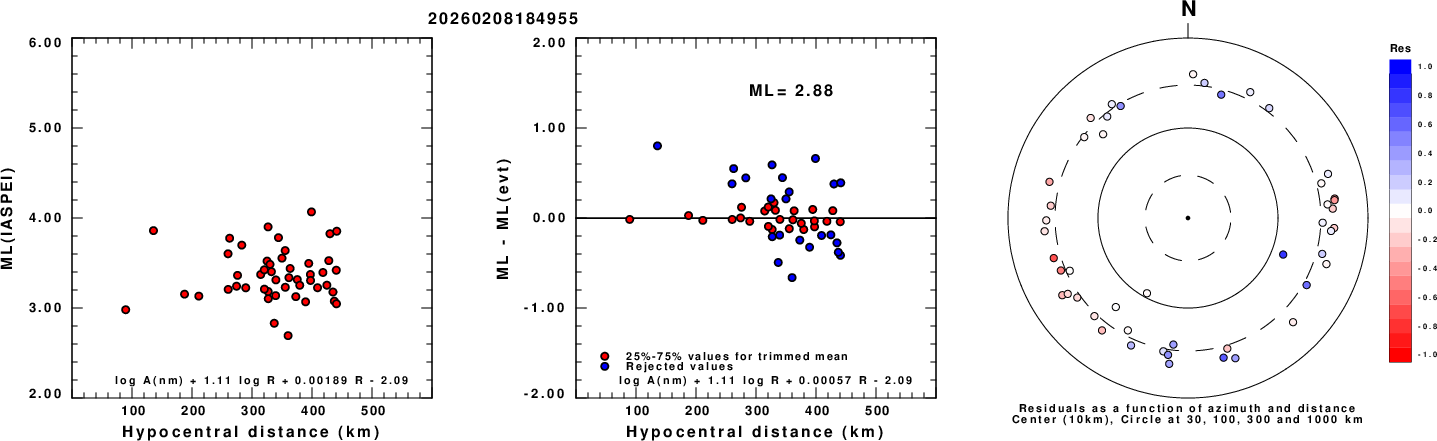 Given the availability of digital waveforms for determination of the moment tensor, this section documents the added processing leading to mLg, if appropriate to the region, and ML by application of the respective IASPEI formulae. As a research study, the linear distance term of the IASPEI formula for ML is adjusted to remove a linear distance trend in residuals to give a regionally defined ML. The defined ML uses horizontal component recordings, but the same procedure is applied to the vertical components since there may be some interest in vertical component ground motions. Residual plots versus distance may indicate interesting features of ground motion scaling in some distance ranges. A residual plot of the regionalized magnitude is given as a function of distance and azimuth, since data sets may transcend different wave propagation provinces.