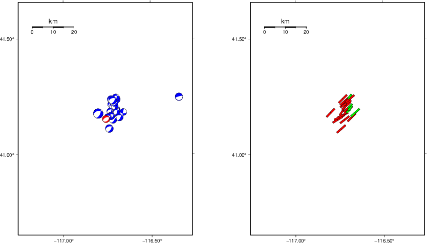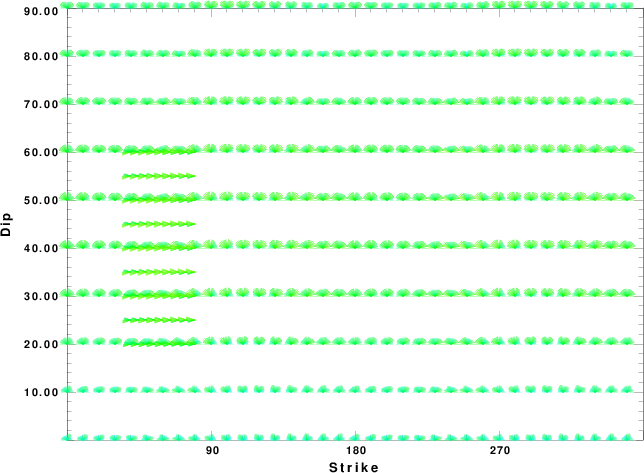 | Focal mechanism sensitivity at the preferred depth. The red color indicates a very good fit to the waveforms. Each solution is plotted as a vector at a given value of strike and dip with the angle of the vector representing the rake angle, measured, with respect to the upward vertical (N) in the figure. |