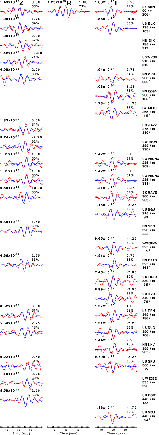 The comparison of the observed and predicted waveforms is given in the next figure. The red traces are the observed and the blue are the predicted. Each observed-predicted component is plotted to the same scale and peak amplitudes are indicated by the numbers to the left of each trace. A pair of numbers is given in black at the right of each predicted traces. The upper number it the time shift required for maximum correlation between the observed and predicted traces. This time shift is required because the synthetics are not computed at exactly the same distance as the observed, the velocity model used in the predictions may not be perfect and the epicentral parameters may be be off. A positive time shift indicates that the prediction is too fast and should be delayed to match the observed trace (shift to the right in this figure). A negative value indicates that the prediction is too slow. The lower number gives the percentage of variance reduction to characterize the individual goodness of fit (100% indicates a perfect fit).