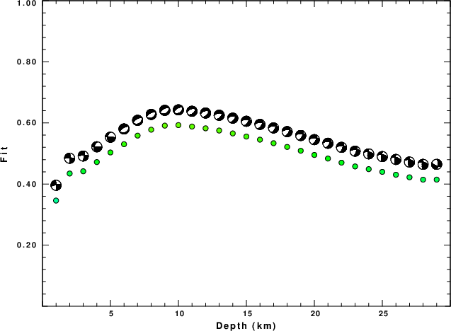 The program wvfgrd96 was used with good traces observed at short distance to determine the focal mechanism, depth and seismic moment. This technique requires a high quality signal and well determined velocity model for the Green's functions. To the extent that these are the quality data, this type of mechanism should be preferred over the radiation pattern technique which requires the separate step of defining the pressure and tension quadrants and the correct strike.