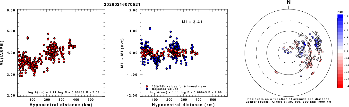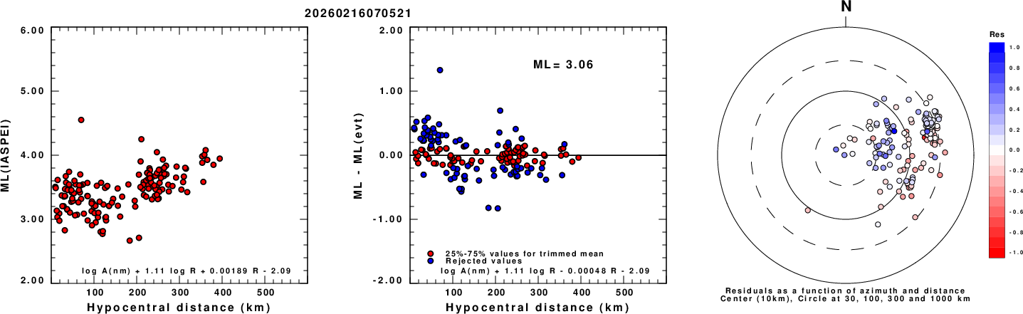 Left: ML computed using the IASPEI formula for Vertical components (research). Center: ML residuals computed using a modified IASPEI formula that accounts for path specific attenuation; the values used for the trimmed mean are indicated. The ML relation used for each figure is given at the bottom of each plot.