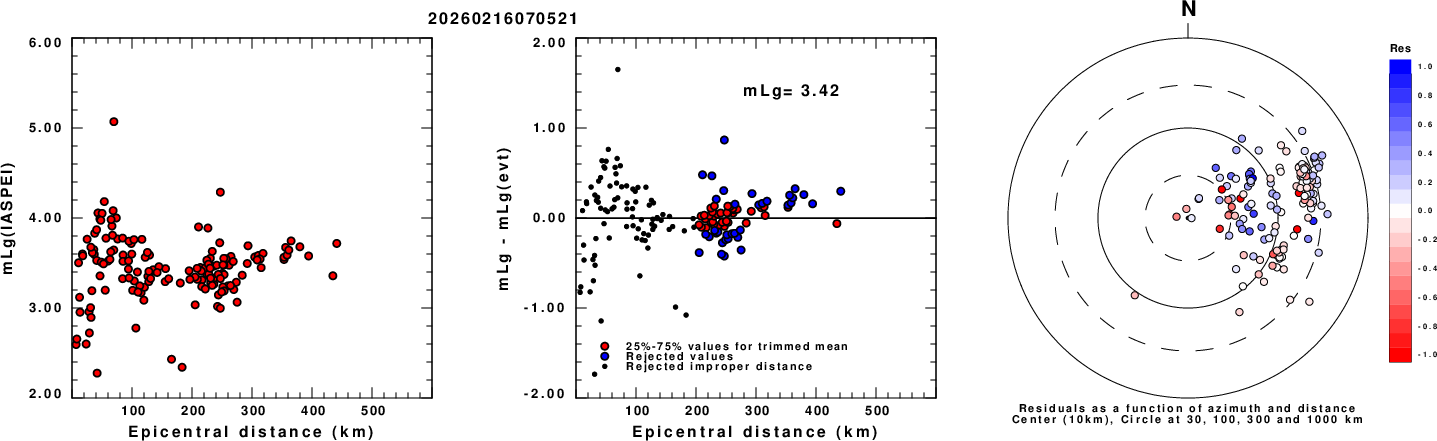Left: mLg computed using the IASPEI formula. Center: mLg residuals versus epicentral distance ; the values used for the trimmed mean magnitude estimate are indicated.