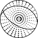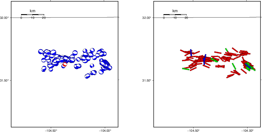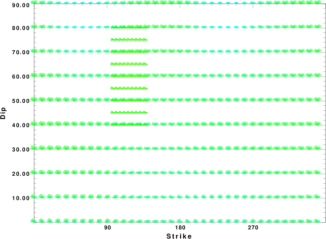 | Focal mechanism sensitivity at the preferred depth. The red color indicates a very good fit to the waveforms. Each solution is plotted as a vector at a given value of strike and dip with the angle of the vector representing the rake angle, measured, with respect to the upward vertical (N) in the figure. |