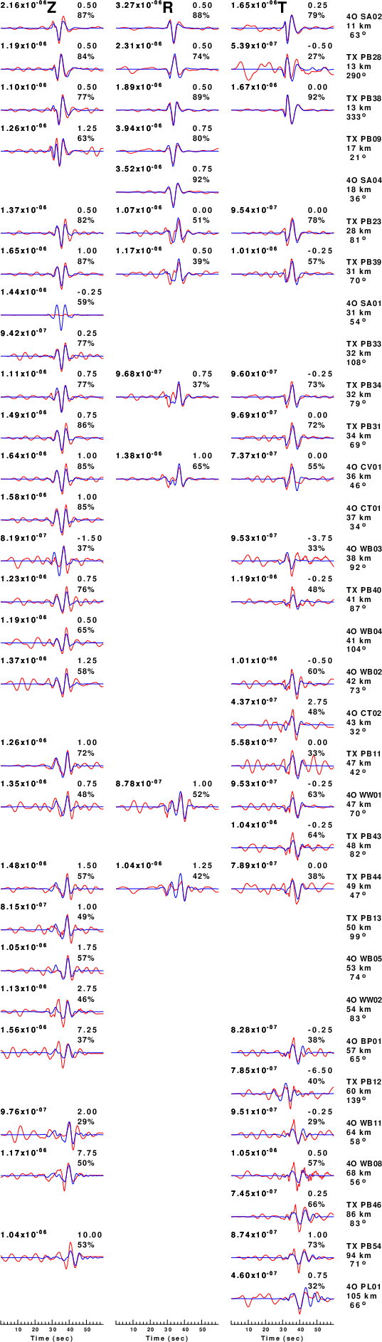 The comparison of the observed and predicted waveforms is given in the next figure. The red traces are the observed and the blue are the predicted. Each observed-predicted component is plotted to the same scale and peak amplitudes are indicated by the numbers to the left of each trace. A pair of numbers is given in black at the right of each predicted traces. The upper number it the time shift required for maximum correlation between the observed and predicted traces. This time shift is required because the synthetics are not computed at exactly the same distance as the observed, the velocity model used in the predictions may not be perfect and the epicentral parameters may be be off. A positive time shift indicates that the prediction is too fast and should be delayed to match the observed trace (shift to the right in this figure). A negative value indicates that the prediction is too slow. The lower number gives the percentage of variance reduction to characterize the individual goodness of fit (100% indicates a perfect fit).