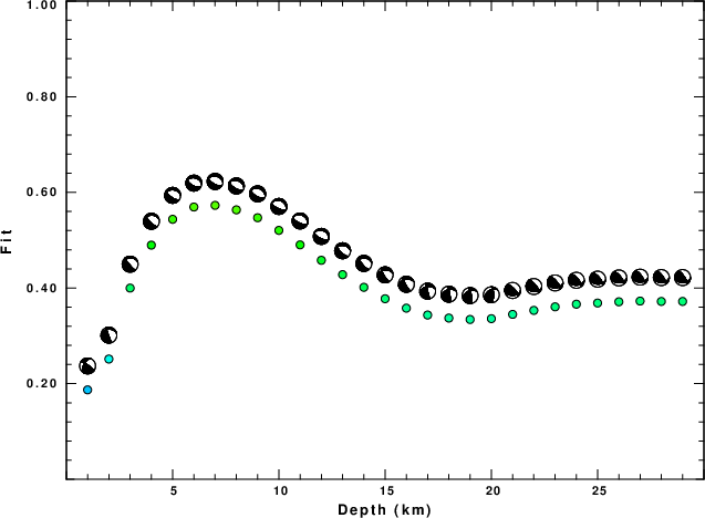 The program wvfgrd96 was used with good traces observed at short distance to determine the focal mechanism, depth and seismic moment. This technique requires a high quality signal and well determined velocity model for the Green's functions. To the extent that these are the quality data, this type of mechanism should be preferred over the radiation pattern technique which requires the separate step of defining the pressure and tension quadrants and the correct strike.
