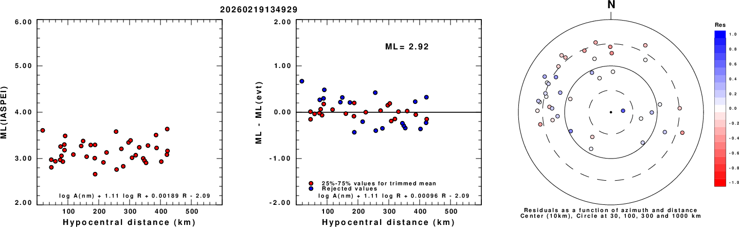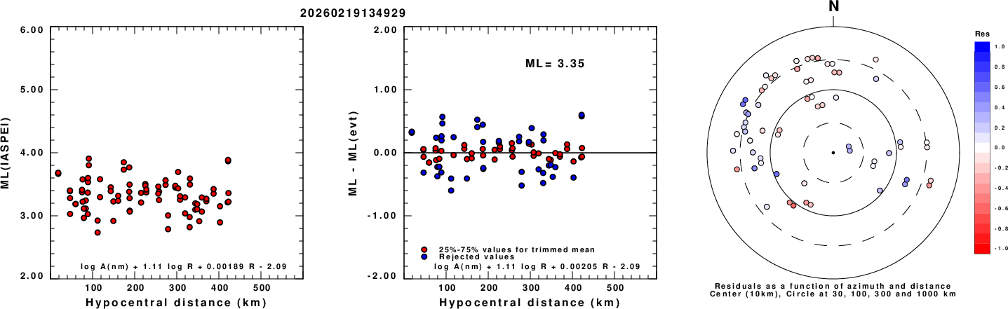 Left: ML computed using the IASPEI formula for Vertical components (research). Center: ML residuals computed using a modified IASPEI formula that accounts for path specific attenuation; the values used for the trimmed mean are indicated. The ML relation used for each figure is given at the bottom of each plot.