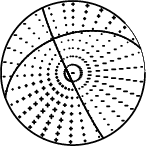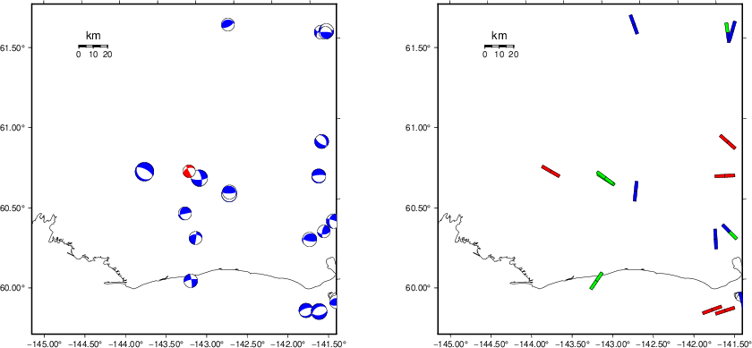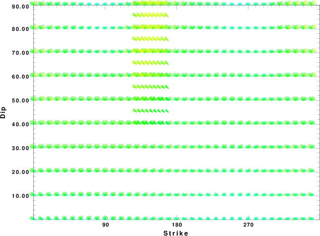 | Focal mechanism sensitivity at the preferred depth. The red color indicates a very good fit to the waveforms. Each solution is plotted as a vector at a given value of strike and dip with the angle of the vector representing the rake angle, measured, with respect to the upward vertical (N) in the figure. |