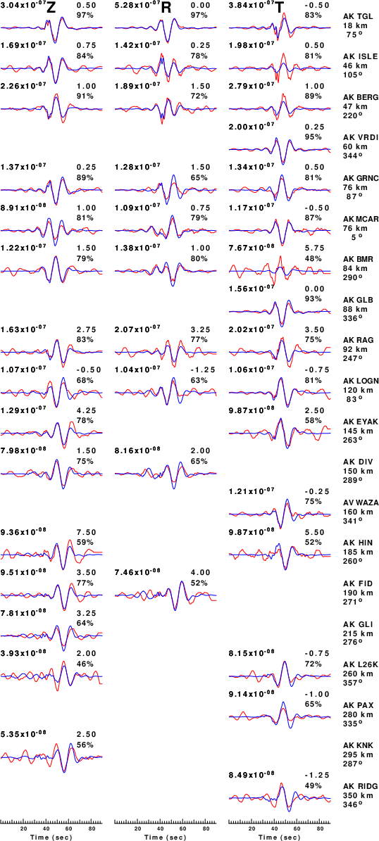 The comparison of the observed and predicted waveforms is given in the next figure. The red traces are the observed and the blue are the predicted. Each observed-predicted component is plotted to the same scale and peak amplitudes are indicated by the numbers to the left of each trace. A pair of numbers is given in black at the right of each predicted traces. The upper number it the time shift required for maximum correlation between the observed and predicted traces. This time shift is required because the synthetics are not computed at exactly the same distance as the observed, the velocity model used in the predictions may not be perfect and the epicentral parameters may be be off. A positive time shift indicates that the prediction is too fast and should be delayed to match the observed trace (shift to the right in this figure). A negative value indicates that the prediction is too slow. The lower number gives the percentage of variance reduction to characterize the individual goodness of fit (100% indicates a perfect fit).