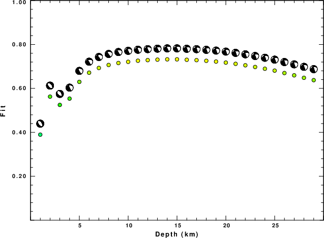 The program wvfgrd96 was used with good traces observed at short distance to determine the focal mechanism, depth and seismic moment. This technique requires a high quality signal and well determined velocity model for the Green's functions. To the extent that these are the quality data, this type of mechanism should be preferred over the radiation pattern technique which requires the separate step of defining the pressure and tension quadrants and the correct strike.