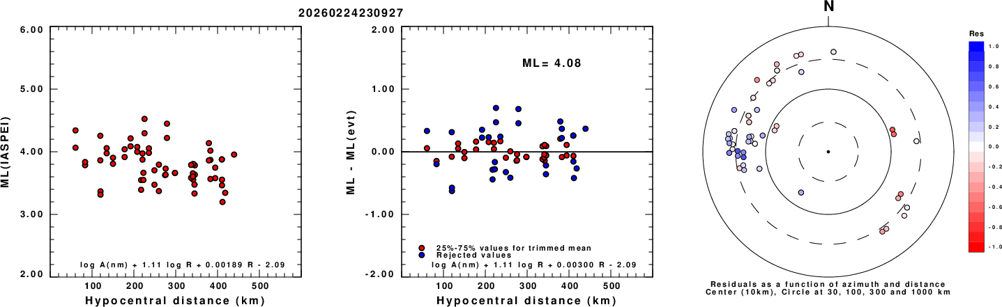 Given the availability of digital waveforms for determination of the moment tensor, this section documents the added processing leading to mLg, if appropriate to the region, and ML by application of the respective IASPEI formulae. As a research study, the linear distance term of the IASPEI formula for ML is adjusted to remove a linear distance trend in residuals to give a regionally defined ML. The defined ML uses horizontal component recordings, but the same procedure is applied to the vertical components since there may be some interest in vertical component ground motions. Residual plots versus distance may indicate interesting features of ground motion scaling in some distance ranges. A residual plot of the regionalized magnitude is given as a function of distance and azimuth, since data sets may transcend different wave propagation provinces.