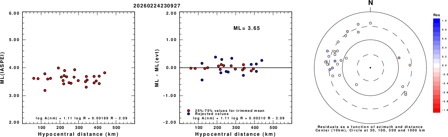 Left: ML computed using the IASPEI formula for Vertical components (research). Center: ML residuals computed using a modified IASPEI formula that accounts for path specific attenuation; the values used for the trimmed mean are indicated. The ML relation used for each figure is given at the bottom of each plot.