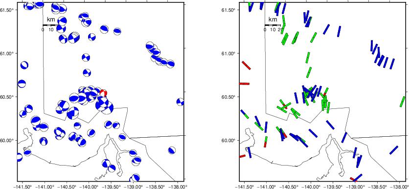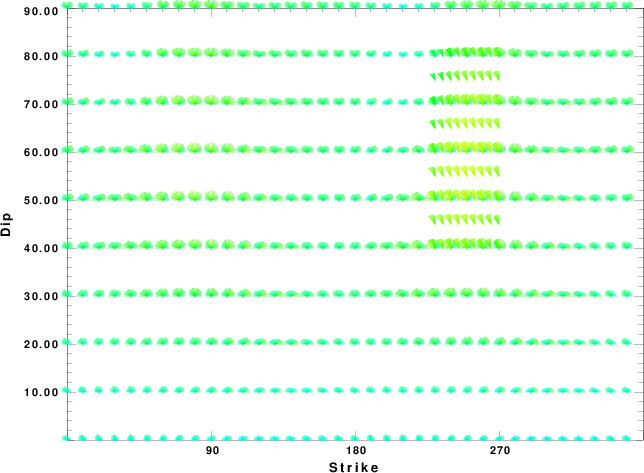 | Focal mechanism sensitivity at the preferred depth. The red color indicates a very good fit to the waveforms. Each solution is plotted as a vector at a given value of strike and dip with the angle of the vector representing the rake angle, measured, with respect to the upward vertical (N) in the figure. |