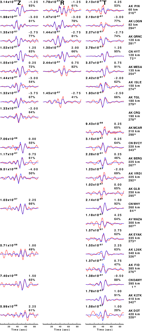 The comparison of the observed and predicted waveforms is given in the next figure. The red traces are the observed and the blue are the predicted. Each observed-predicted component is plotted to the same scale and peak amplitudes are indicated by the numbers to the left of each trace. A pair of numbers is given in black at the right of each predicted traces. The upper number it the time shift required for maximum correlation between the observed and predicted traces. This time shift is required because the synthetics are not computed at exactly the same distance as the observed, the velocity model used in the predictions may not be perfect and the epicentral parameters may be be off. A positive time shift indicates that the prediction is too fast and should be delayed to match the observed trace (shift to the right in this figure). A negative value indicates that the prediction is too slow. The lower number gives the percentage of variance reduction to characterize the individual goodness of fit (100% indicates a perfect fit).