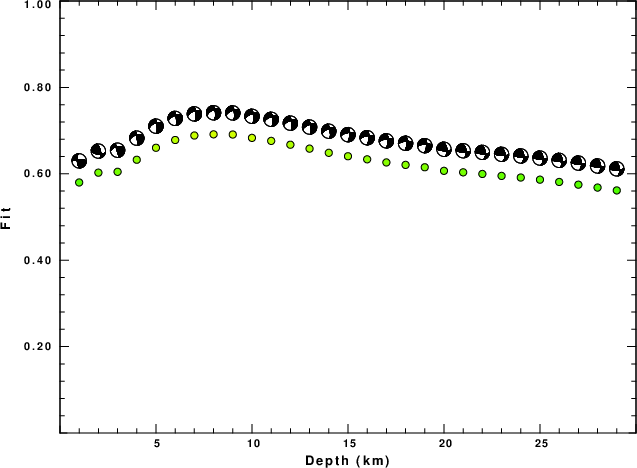 The program wvfgrd96 was used with good traces observed at short distance to determine the focal mechanism, depth and seismic moment. This technique requires a high quality signal and well determined velocity model for the Green's functions. To the extent that these are the quality data, this type of mechanism should be preferred over the radiation pattern technique which requires the separate step of defining the pressure and tension quadrants and the correct strike.