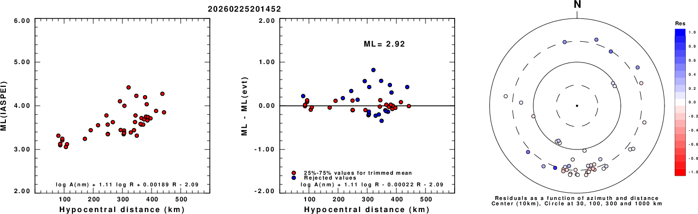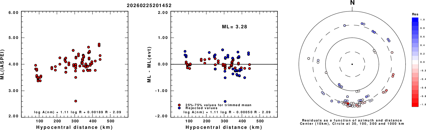 Left: ML computed using the IASPEI formula for Vertical components (research). Center: ML residuals computed using a modified IASPEI formula that accounts for path specific attenuation; the values used for the trimmed mean are indicated. The ML relation used for each figure is given at the bottom of each plot.
