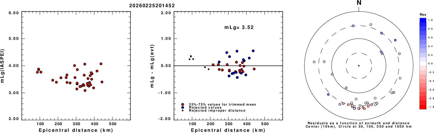 Left: mLg computed using the IASPEI formula. Center: mLg residuals versus epicentral distance ; the values used for the trimmed mean magnitude estimate are indicated.