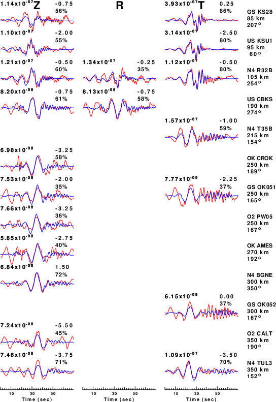 The comparison of the observed and predicted waveforms is given in the next figure. The red traces are the observed and the blue are the predicted. Each observed-predicted component is plotted to the same scale and peak amplitudes are indicated by the numbers to the left of each trace. A pair of numbers is given in black at the right of each predicted traces. The upper number it the time shift required for maximum correlation between the observed and predicted traces. This time shift is required because the synthetics are not computed at exactly the same distance as the observed, the velocity model used in the predictions may not be perfect and the epicentral parameters may be be off. A positive time shift indicates that the prediction is too fast and should be delayed to match the observed trace (shift to the right in this figure). A negative value indicates that the prediction is too slow. The lower number gives the percentage of variance reduction to characterize the individual goodness of fit (100% indicates a perfect fit).