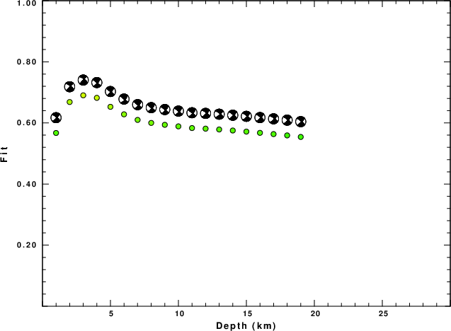 The program wvfgrd96 was used with good traces observed at short distance to determine the focal mechanism, depth and seismic moment. This technique requires a high quality signal and well determined velocity model for the Green's functions. To the extent that these are the quality data, this type of mechanism should be preferred over the radiation pattern technique which requires the separate step of defining the pressure and tension quadrants and the correct strike.
