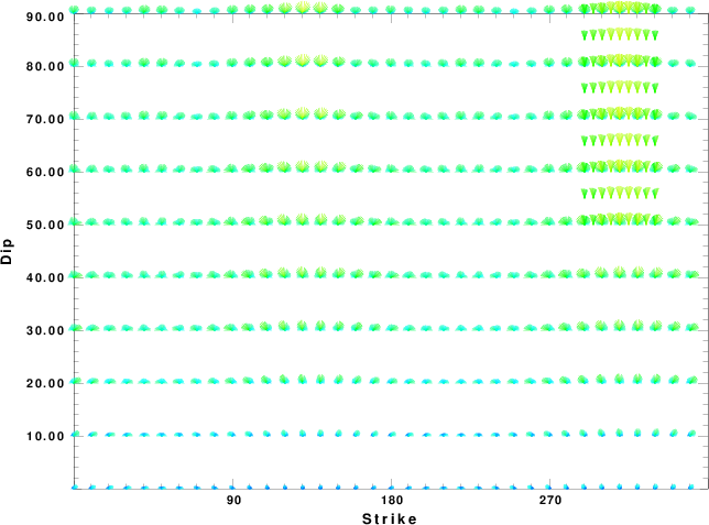 | Focal mechanism sensitivity at the preferred depth. The red color indicates a very good fit to the waveforms. Each solution is plotted as a vector at a given value of strike and dip with the angle of the vector representing the rake angle, measured, with respect to the upward vertical (N) in the figure. |