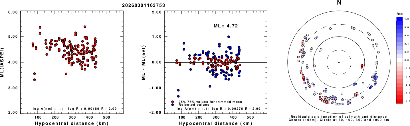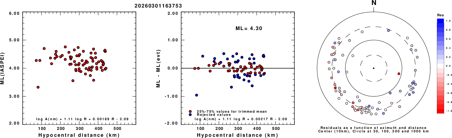 Left: ML computed using the IASPEI formula for Vertical components (research). Center: ML residuals computed using a modified IASPEI formula that accounts for path specific attenuation; the values used for the trimmed mean are indicated. The ML relation used for each figure is given at the bottom of each plot.