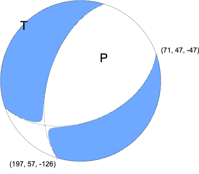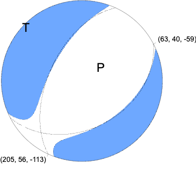Moment Tensor Moment 3.001e+15 N-m Magnitude 4.25 Depth 11.0 km Percent DC 98% Half Duration - Catalog NN Data Source NN Contributor NN Nodal Planes Plane Strike Dip Rake NP1 197 57 -126 NP2 71 47 -47 Principal Axes Axis Value Plunge Azimuth T 3.015e+15 5 312 N -0.027e+15 30 219 P -2.987e+15 60 51 |