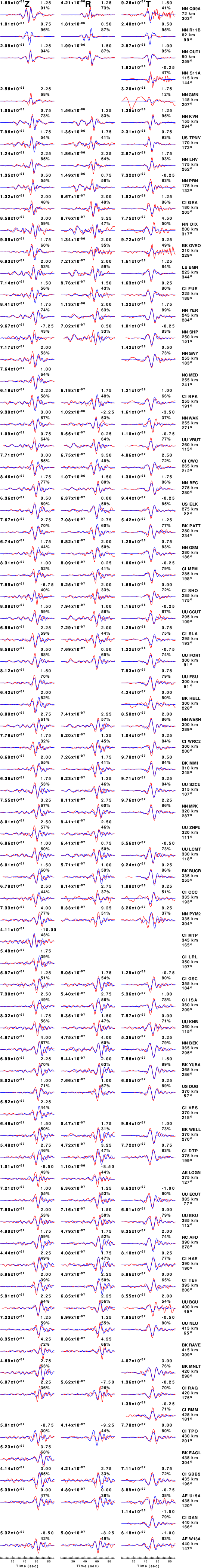 The comparison of the observed and predicted waveforms is given in the next figure. The red traces are the observed and the blue are the predicted. Each observed-predicted component is plotted to the same scale and peak amplitudes are indicated by the numbers to the left of each trace. A pair of numbers is given in black at the right of each predicted traces. The upper number it the time shift required for maximum correlation between the observed and predicted traces. This time shift is required because the synthetics are not computed at exactly the same distance as the observed, the velocity model used in the predictions may not be perfect and the epicentral parameters may be be off. A positive time shift indicates that the prediction is too fast and should be delayed to match the observed trace (shift to the right in this figure). A negative value indicates that the prediction is too slow. The lower number gives the percentage of variance reduction to characterize the individual goodness of fit (100% indicates a perfect fit).