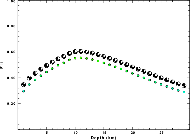 The program wvfgrd96 was used with good traces observed at short distance to determine the focal mechanism, depth and seismic moment. This technique requires a high quality signal and well determined velocity model for the Green's functions. To the extent that these are the quality data, this type of mechanism should be preferred over the radiation pattern technique which requires the separate step of defining the pressure and tension quadrants and the correct strike.