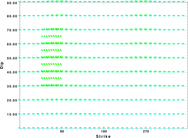| Focal mechanism sensitivity at the preferred depth. The red color indicates a very good fit to the waveforms. Each solution is plotted as a vector at a given value of strike and dip with the angle of the vector representing the rake angle, measured, with respect to the upward vertical (N) in the figure. |