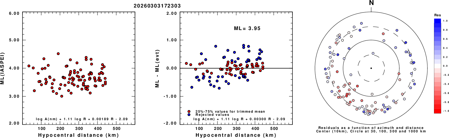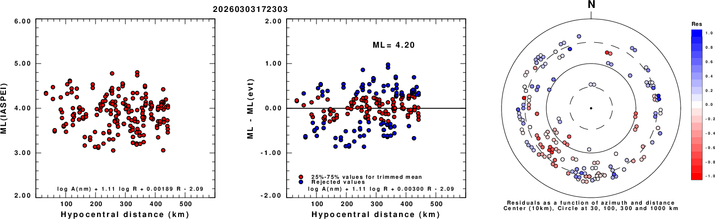 Left: ML computed using the IASPEI formula for Vertical components (research). Center: ML residuals computed using a modified IASPEI formula that accounts for path specific attenuation; the values used for the trimmed mean are indicated. The ML relation used for each figure is given at the bottom of each plot.